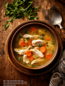 Serve the soup hot, ladling into bowls and garnishing with fresh herbs or a squeeze of lemon if desired. The broth should be rich, the vegetables tender, and the chicken succulent — a comforting, rustic dish ready to warm you from the inside out.