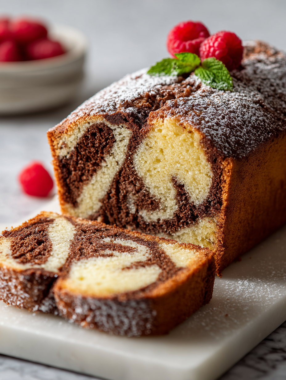 - Slice the cake with a serrated knife to reveal the beautiful marbled pattern inside. Serve slices slightly warm or at room temperature, enjoying the tender crumb and rich aroma of vanilla and cocoa.