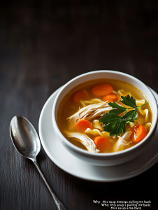 This comforting chicken soup features a smoky, flavorful broth simmered with bone-in chicken, carrots, celery, and aromatic herbs. The slow simmering process yields tender chicken meat and a clear, rich broth with a warm, rustic appearance, finished with bright herbs and a splash of citrus for added zing.