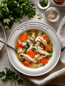It’s the smell of simmering chicken, slowly filling the house with homey warmth. Every spoonful feels like a quiet celebration of simple flavors, unpolished and honest. It’s the kind of meal that reminds you of the slow, unhurried days of childhood, yet always feels new each time.