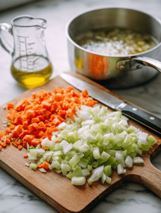 1. Gather all your ingredients and tools to start. Chop the onion, slice the carrots and celery, and set everything nearby.