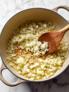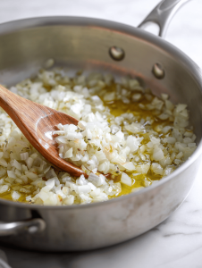2. Heat the large heavy-bottomed pot over medium heat and add a splash of oil if needed. Sauté the chopped onion until it becomes translucent and fragrant, about 5-7 minutes.