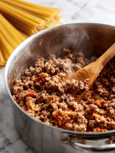 3. Add the ground beef or sausage to the pot and cook until browned and crumbly, about 8 minutes. Use a wooden spoon to break up the meat as it cooks.