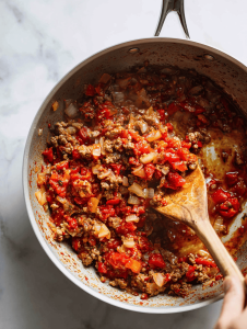 - Add the diced tomatoes with their juice, chili powder, cumin, and cayenne pepper. Mix well, bringing everything to a gentle simmer.