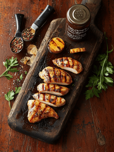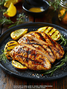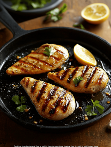 This grilled chicken breast recipe uses a flavorful marinade of lemon juice, smoked paprika, garlic, and honey to infuse the meat with bright, smoky flavors. The chicken is cooked to tender, juicy perfection with a beautifully charred exterior, showcasing a vibrant citrus glow and smoky caramelization.