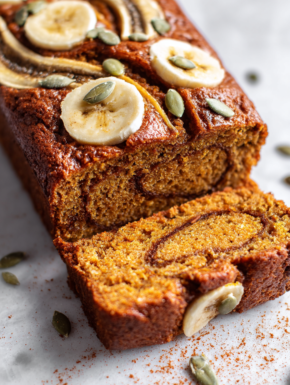 This pumpkin banana bread combines the warmth of seasonal spices with the moist, tender crumb of a quick bread. Made with pumpkin puree, ripe bananas, and a blend of cinnamon, nutmeg, and cloves, it bakes into a golden loaf with a fragrant, cozy aroma. The final texture is soft yet hearty, perfect for breakfast, snacks, or a comforting dessert.